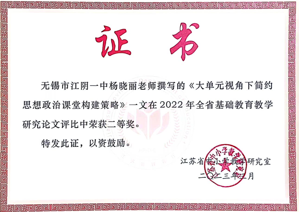 网站类目:研究成果获奖 姓名:杨晓丽 所在单位:江阴市山观高级中学 获奖类别:论文比赛 获奖级别:省级 获奖等级: 获奖时间:2024-09-19 评比部门:江苏省中小学教学研究室 发表刊物: 刊物级别:省级 发表时间:2024-09-19