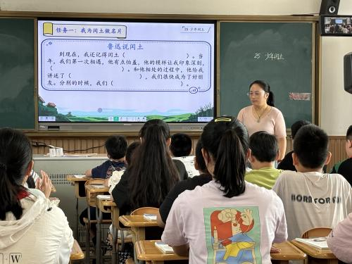 新桥中心小学钱洁老师执教六年级上册的《少年闰土》。钱老师设计了找“错别字”的趣味活动,拉近学生和鲁迅之间的关系,借助老师提供的资料帮助学生对鲁迅的语文和身份有了初步感知。接着落实了三大任务的教学实践:我为闰土做名片、我学闰土讲趣事、我为闰土“画”个像。引导学生整体感知课文内容,读中体会人物个性,生动有趣地讲述故事,并学习文章表达方法,将其他趣事以画面的形式进行“定格”。任务群活动设计不仅让学生感受到了鲁迅作品的特点,更是提升了学生的语文素养,真正做到了“在活动中做事,在做事中成人。”