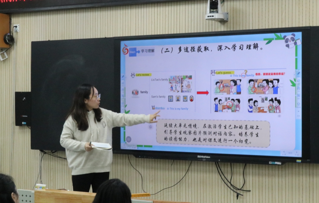 接下来,钱晨晨老师从教材分析、目标设定、教学活动设计及作业设计几方面简单阐述了自己对第一课时的教学设计。本课时从主题图引入情境,让学生观察主题图自然学习本单元所需学习的重点词汇。对卡通故事的教学时,通过看、听、读多种活动,充分调动学生视听说等多种感官,引导学生在主题情景中学习对话,梳理故事情节,在具体的语境中学习单元核心语言,促进语言的真实内化。同时,鼓励学生探究故事情节背后的原因,感受卡通故事的趣味性。让学生真正以语言为载体,将思维外显,助力思维品质和语言能力的双重提升。最后根据板书进行总结,再次回归本单元的Big question,再次让学生思考,引导学生结合本课时的学习内容表达自己的观点,让学生对大家庭初步形成自己的理解与认知,同时也是对单课时主题意义的凝练,也为后续深入探究家庭的意义提供思想基础。