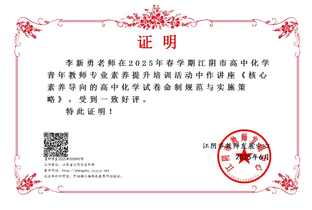 李新勇老师在江阴市高中化学青年教师专业素养提升培训活动中开设讲座