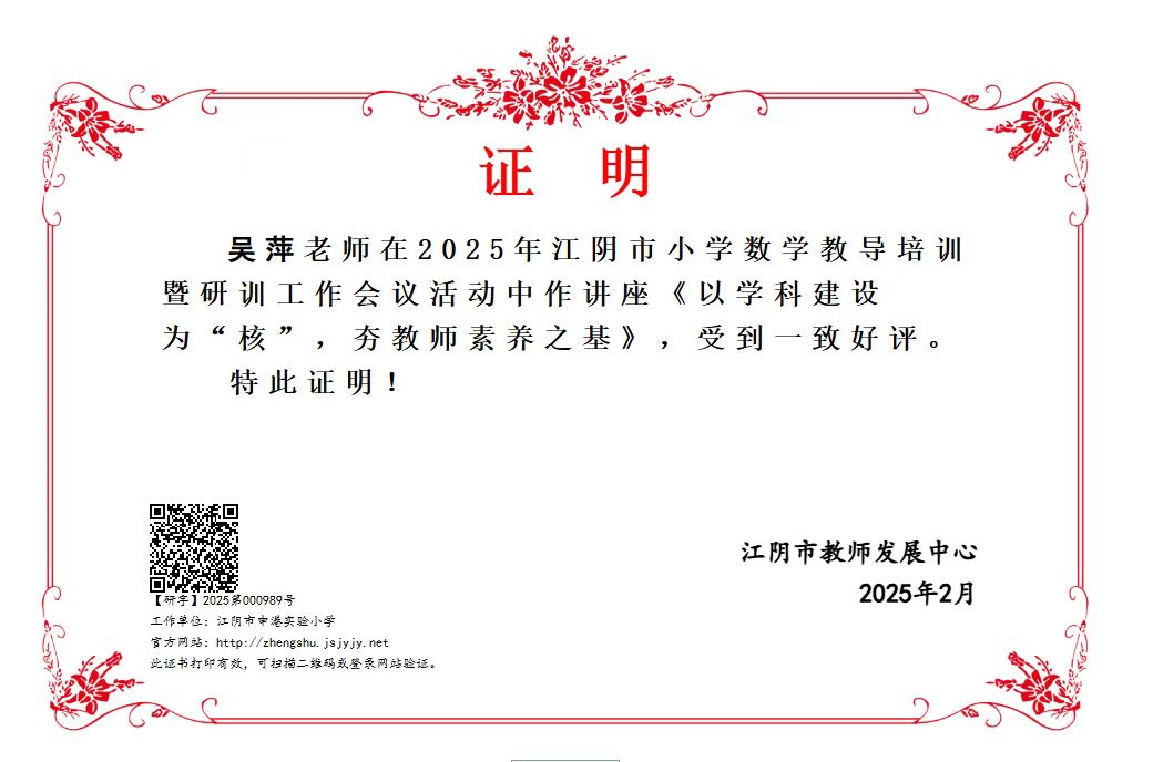 吴萍在江阴市小学数学教导培训活动中作讲座《以学科建设为“核”,夯教师素养之基》(市级) 2025-09-07