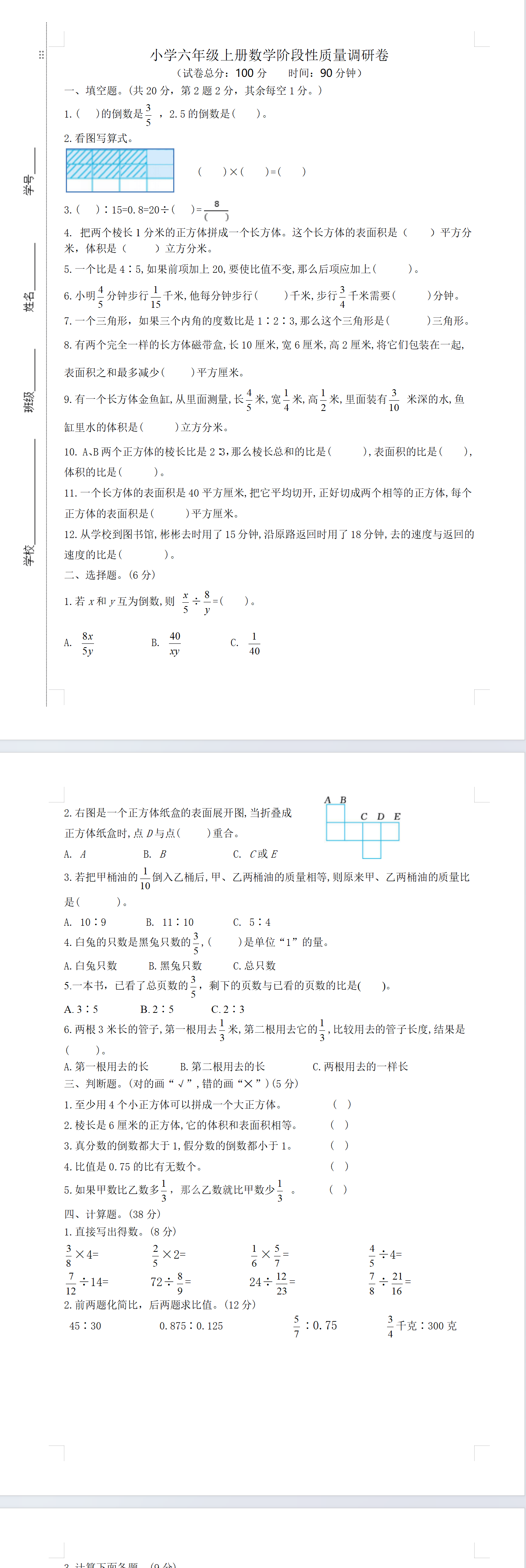 单烨设计小学六年级上册数学阶段性质量调研卷 2025-09-07