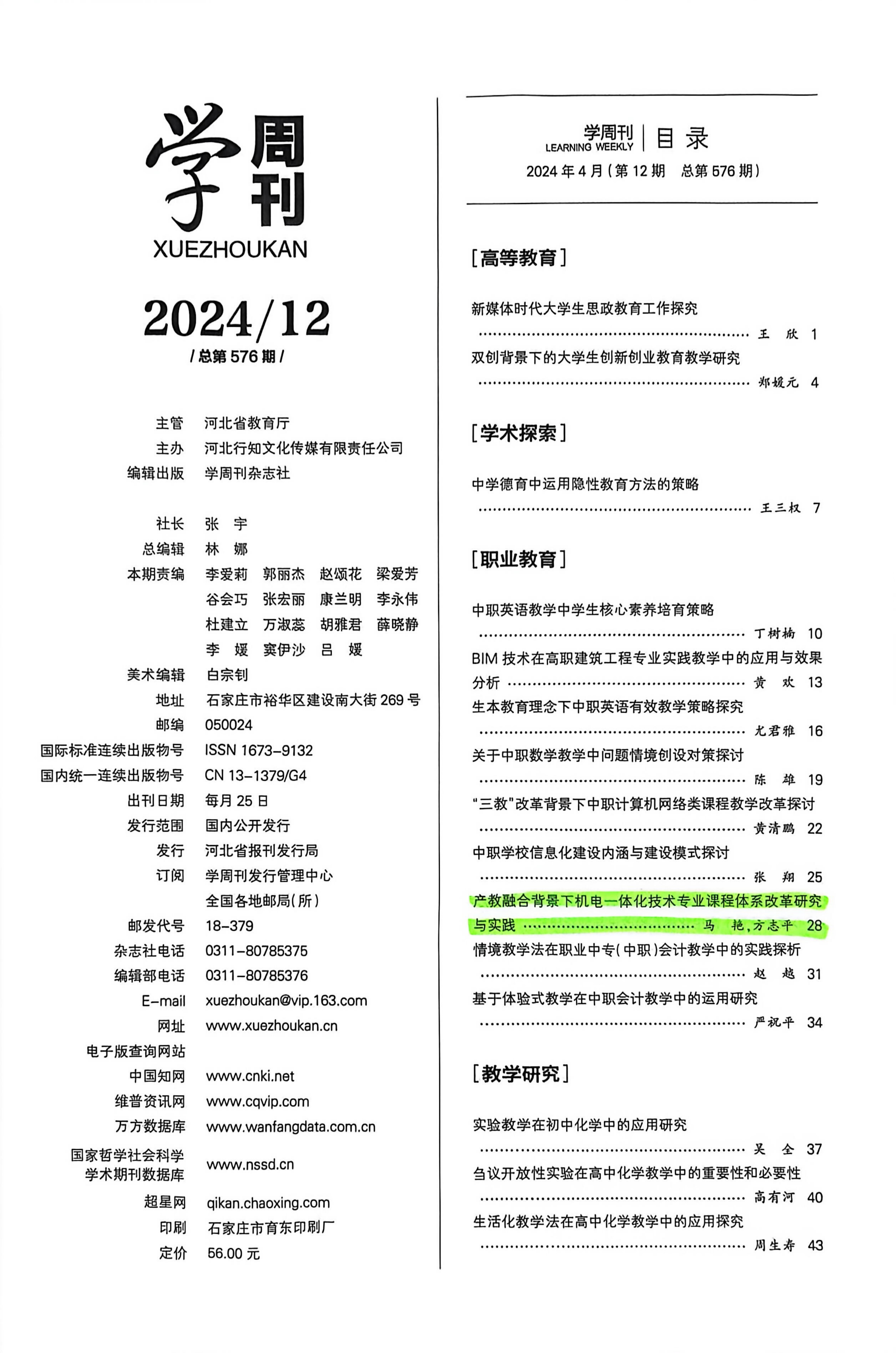 马艳:论文《产教融合背景下机电一体化技术专业课程体系改革研究与实践》发表于《学周刊》