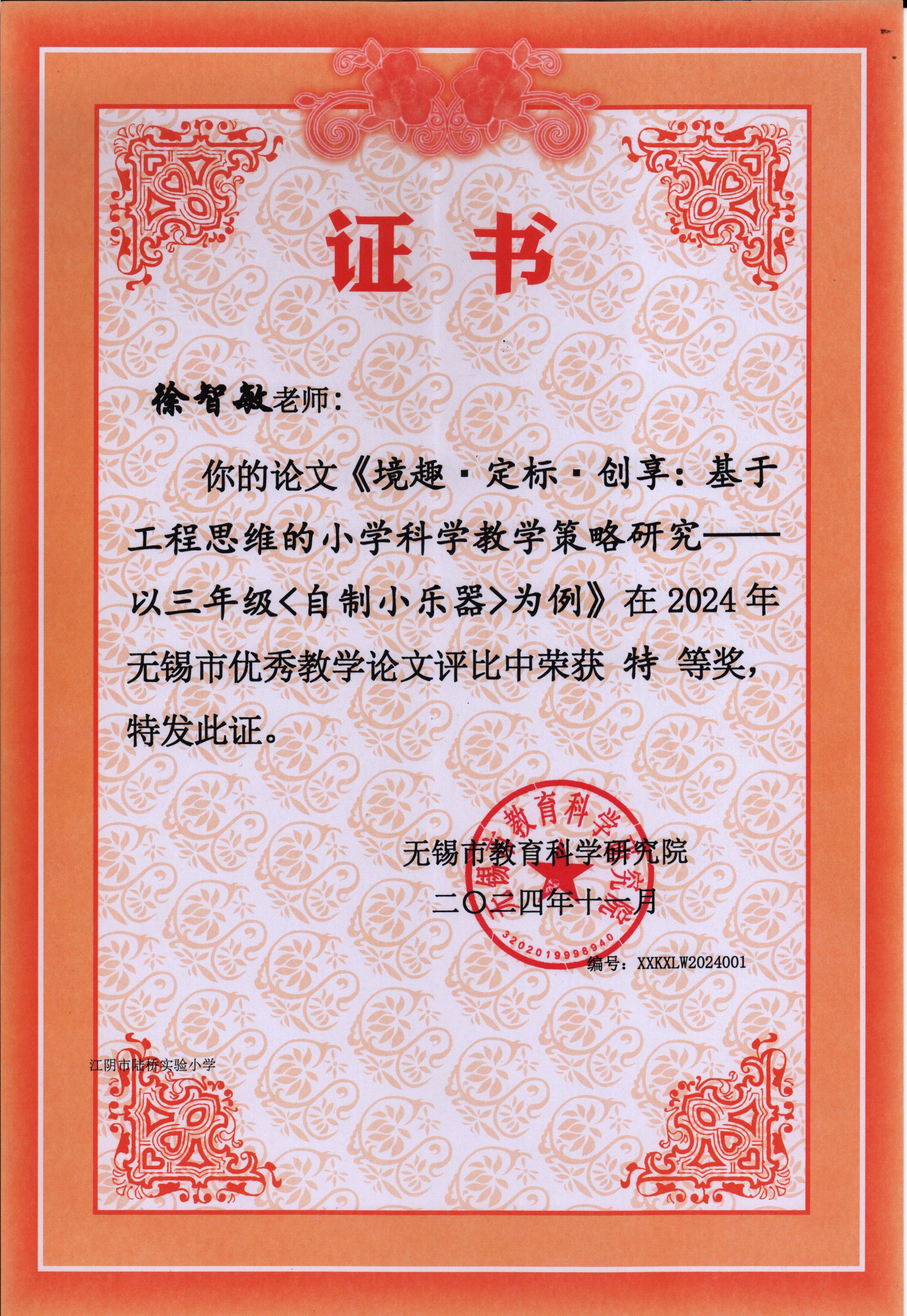 网站类目:研究成果获奖 姓名:徐智敏 所在单位:江阴市陆桥实验小学 获奖类别: 获奖级别:市级 获奖等级: 获奖时间:2024-11-29 评比部门: 发表刊物: 刊物级别:县级 发表时间:2025-09-16