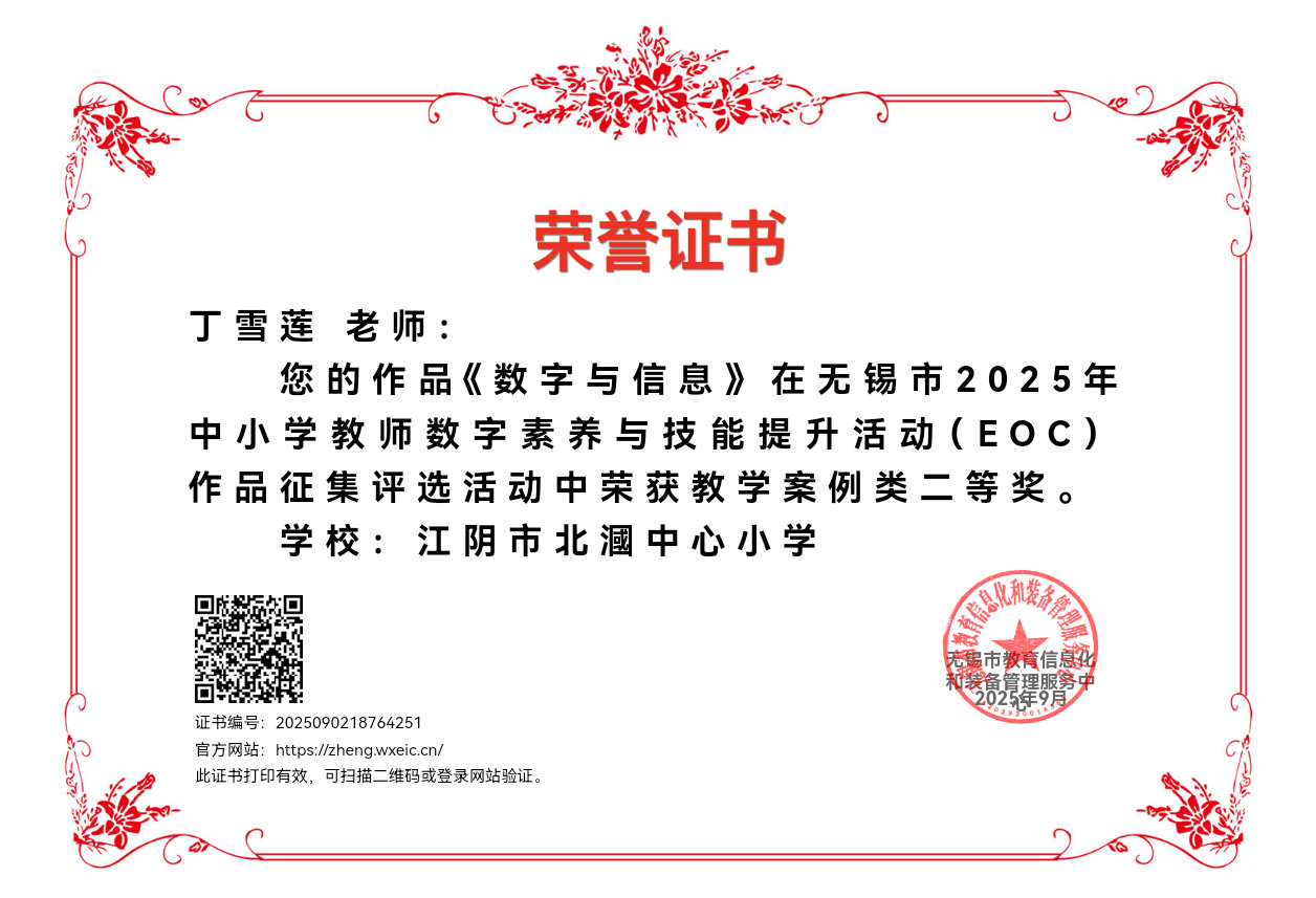 丁雪莲执教的《数字与信息》获无锡市EOC教学案例类二等奖