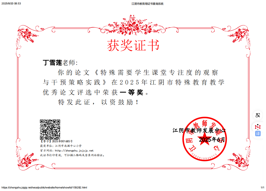 丁雪莲论文《特殊需要学生课堂专注度的观察与干预策略实践》获江阴市一等奖