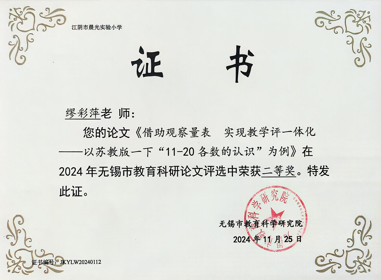 缪彩萍论文《借助观察量表 实现教学评一体化》获无锡市教育科研论文二等奖
