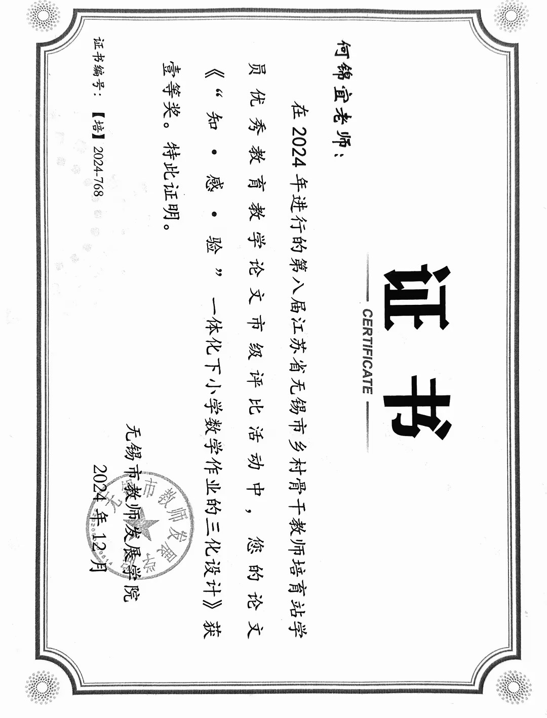 何锦宜《"知·感·验"一体化下小学数学作业的三化设计》荣获无锡优秀教育教学论文评比一等奖 2025-09-18