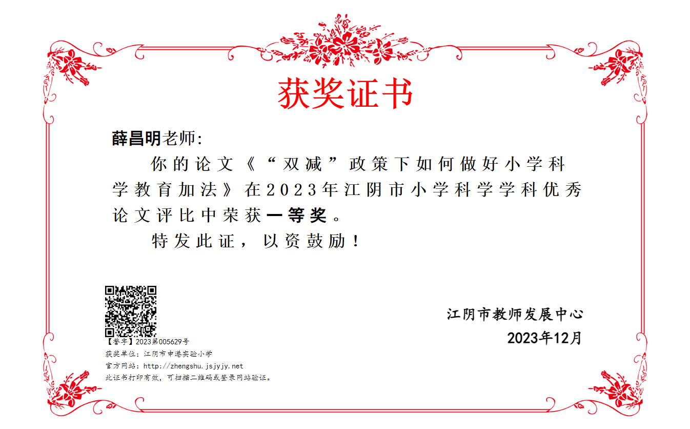 薛昌明老师在2023年小学科学学科优秀论文评比中获一等奖 2025-09-18