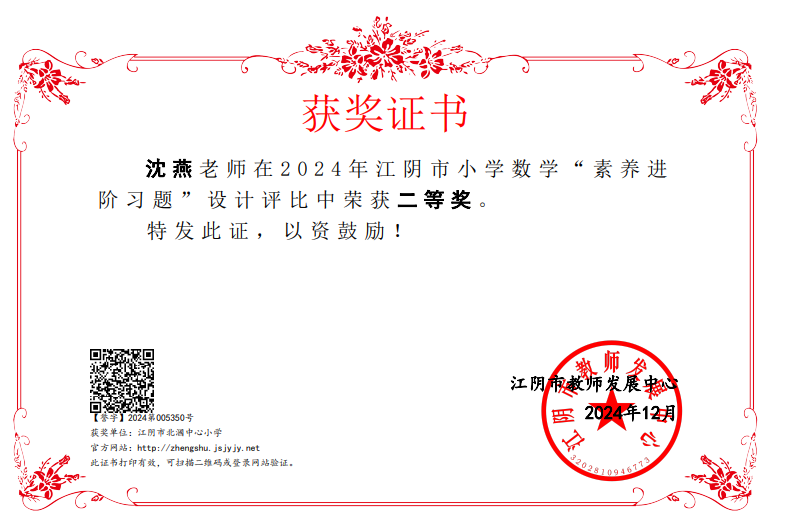 沈燕《江阴市小学数学“素养进 阶习题”设计评比》获奖