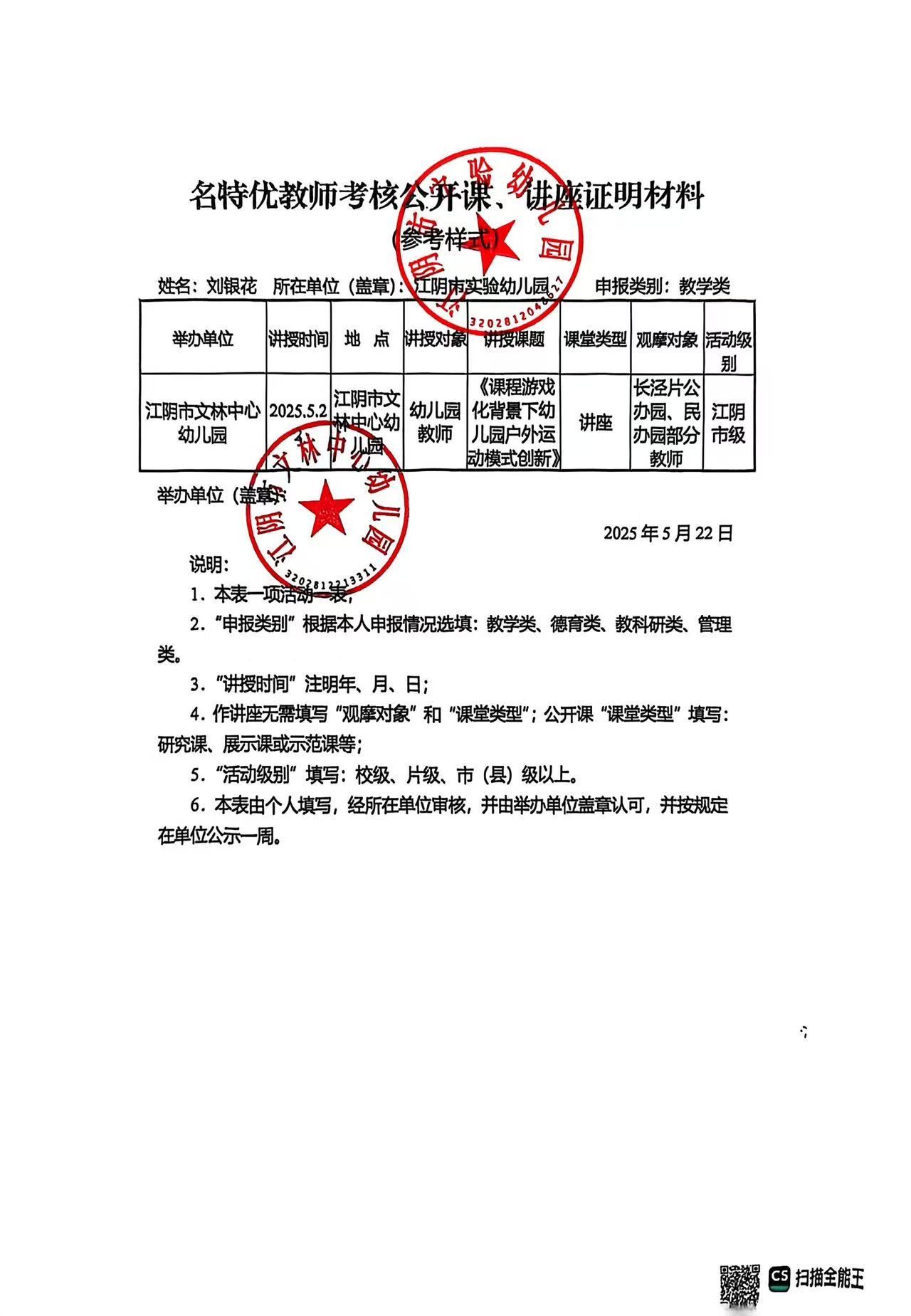 刘银花老师向江阴市文林中心幼儿园全体教师作讲座《课程游戏化背景下幼儿园户外运动模式创新》