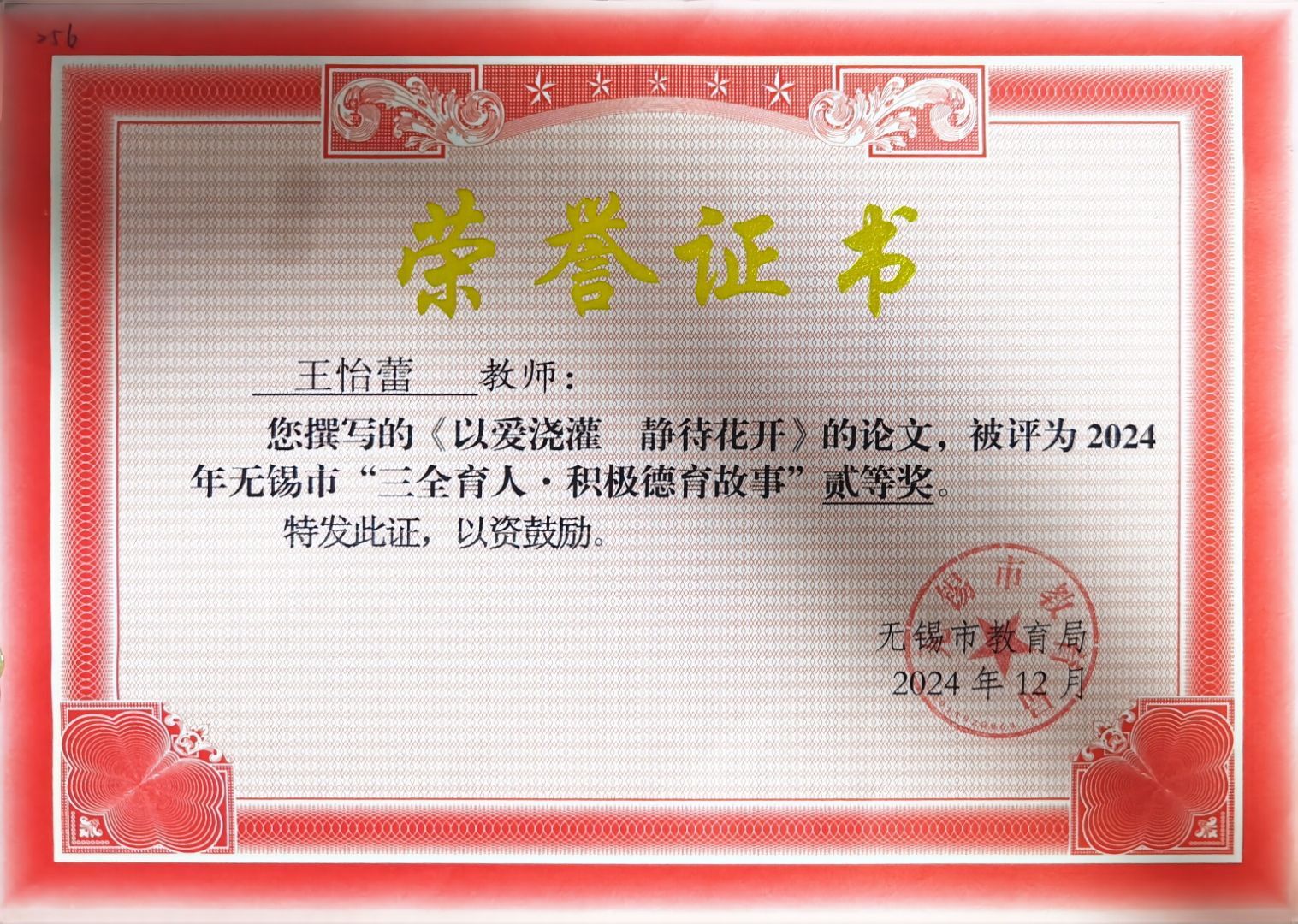 江阴市顾海英德育名师工作室——成员王怡蕾获2024年无锡市“三全育人•积极德育论文”二等奖 2025-09-21