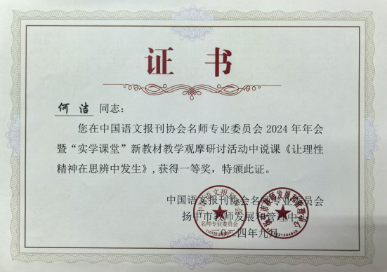 江阴市季勇名师工作室——成员何洁说课《让理性精神在思辨中发生》获一等奖
