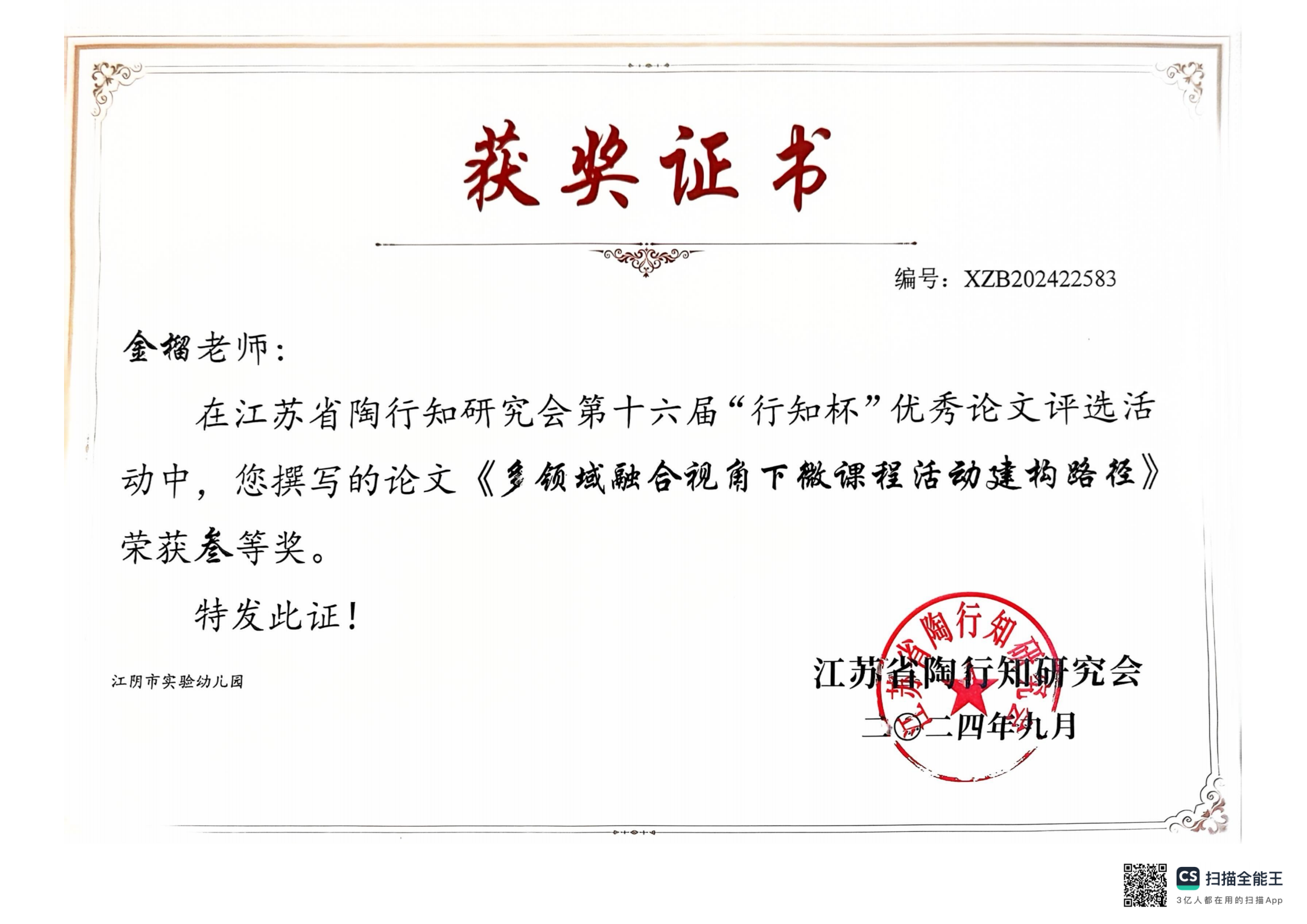 金榴老师撰写的论文获江苏省“行知杯”论文评选三等奖