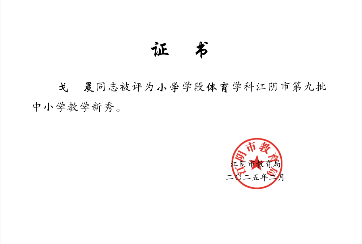 戈晨被评为小学体育学科江阴市第九批教学新秀 2025-09-22