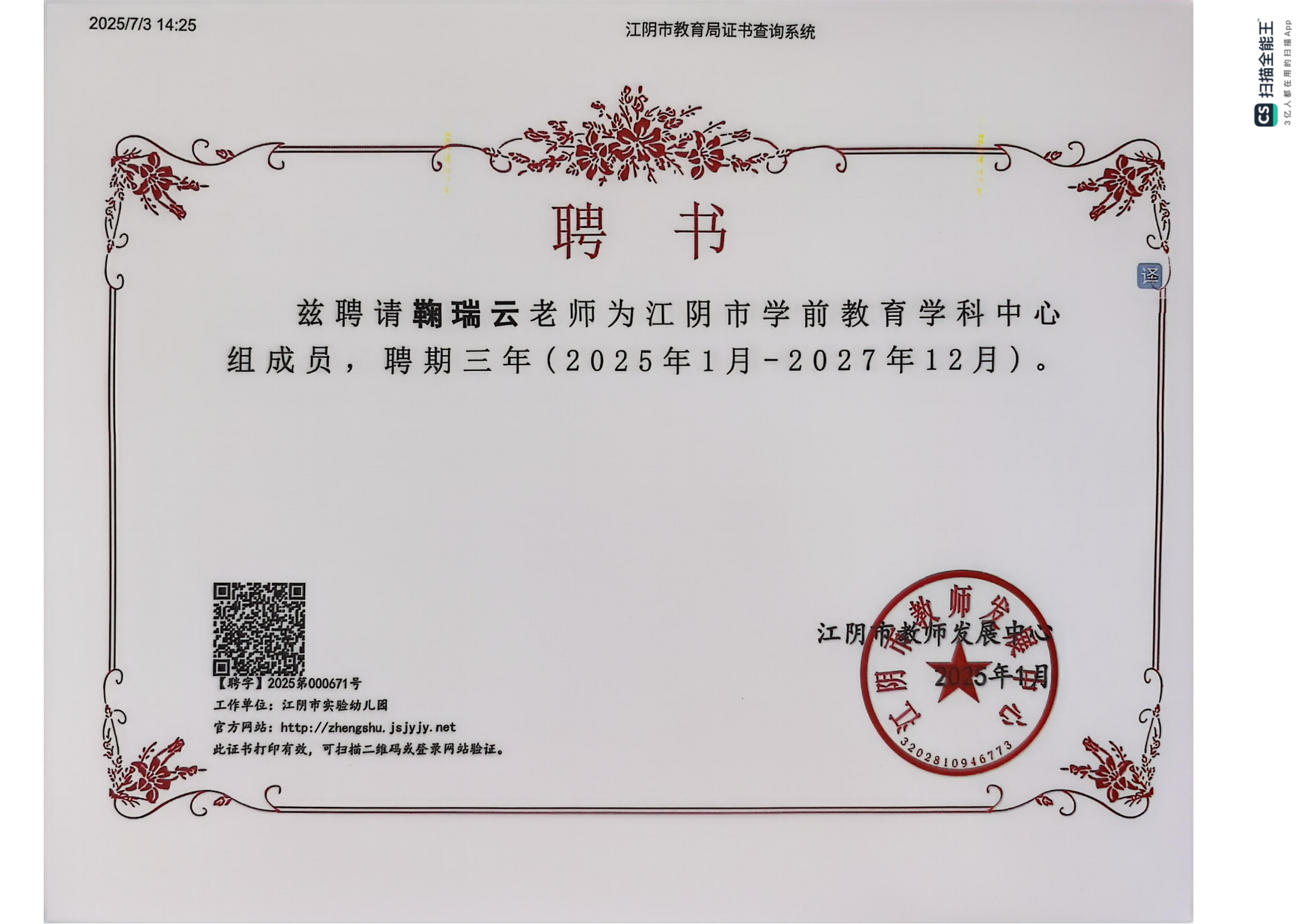 鞠瑞云老师被聘为2024年度江阴市幼儿园教师中级资格评审委员会学科组专家