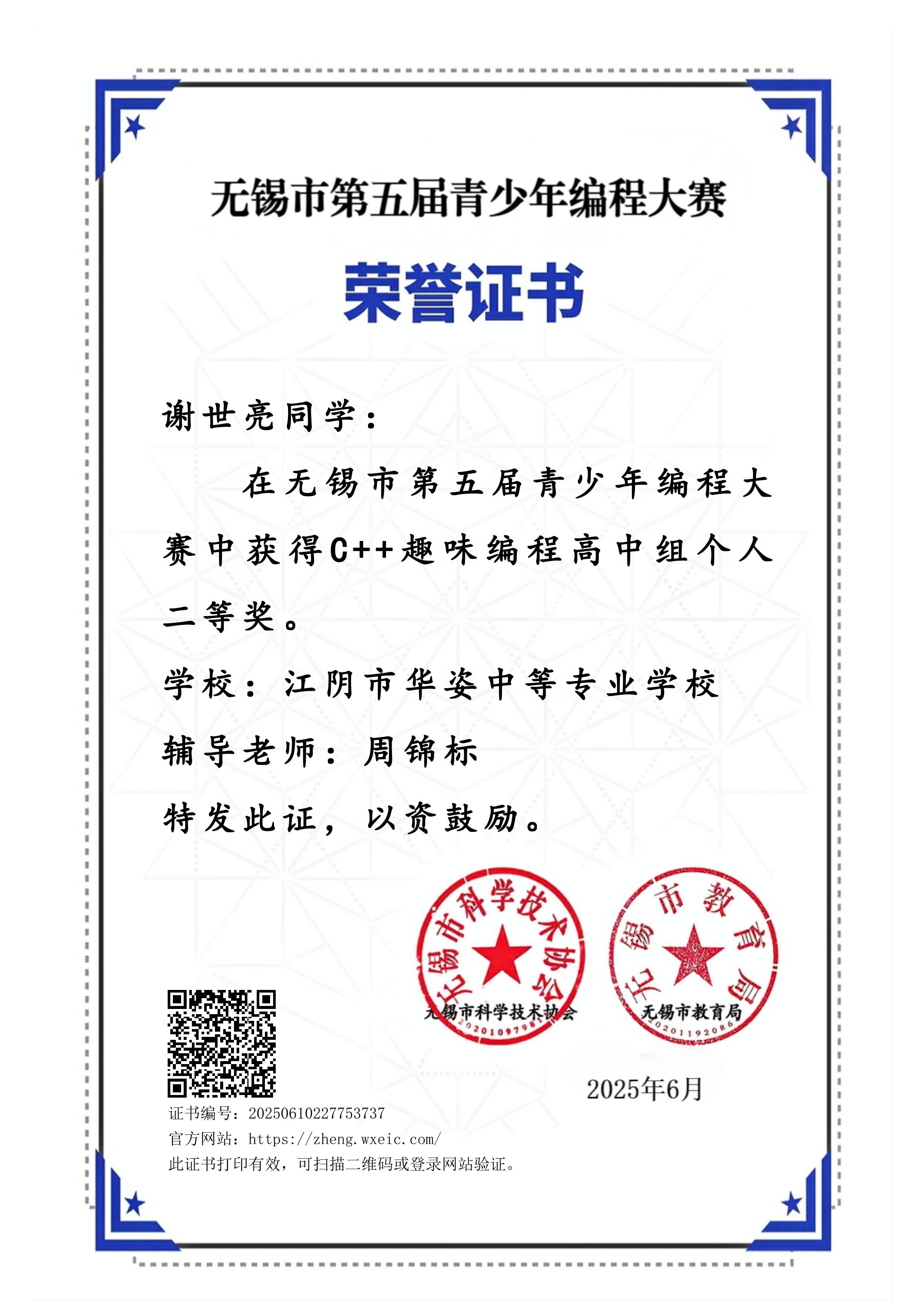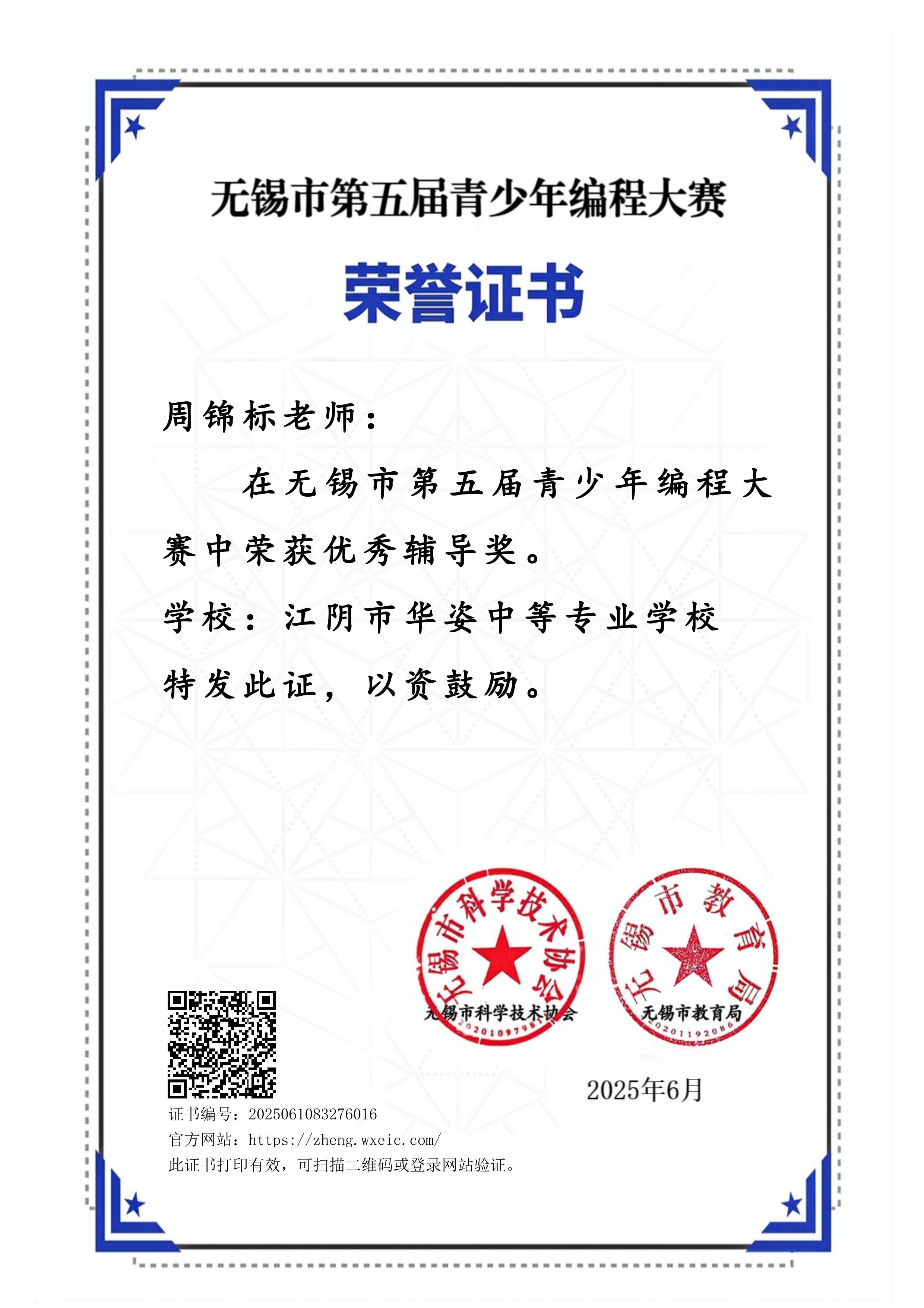 周锦标老师在锡市第五届青少年编程大赛中指导学生获得一等奖、二等奖并获得优秀辅导奖