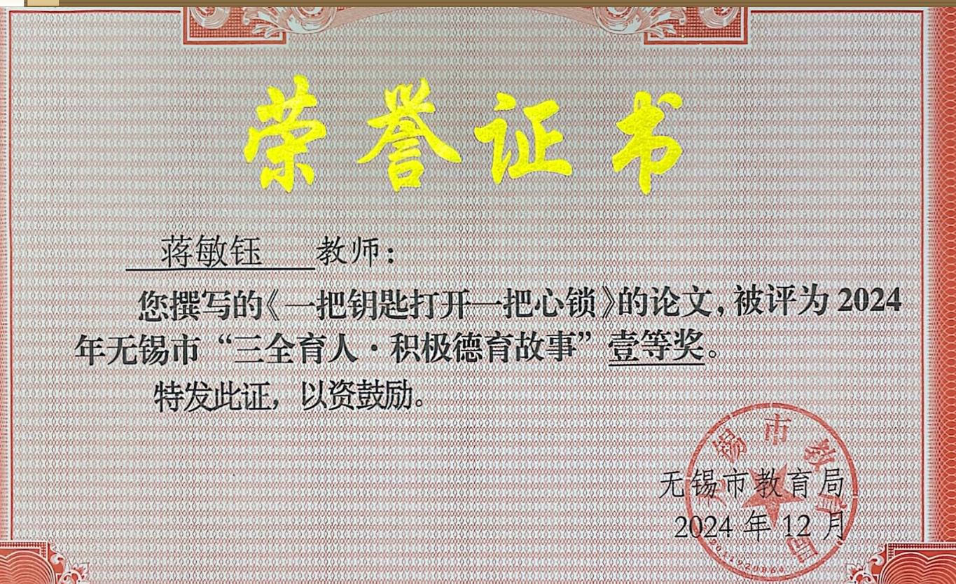 蒋敏钰论文2024.12《一把钥匙打开一把心锁》获无锡一等奖 2025-09-26