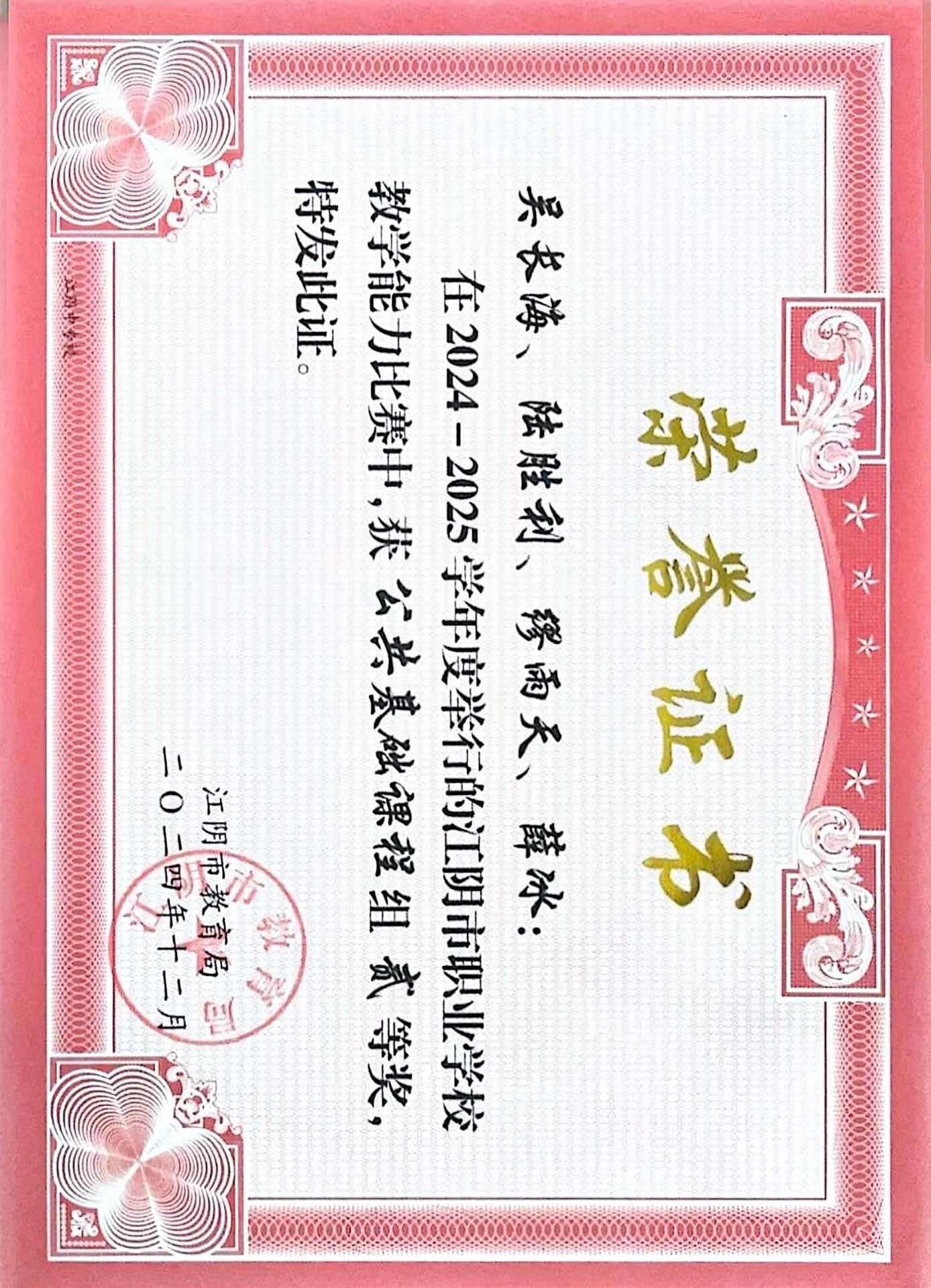 季春花名师工作室成员陆胜利老师在2024-2025学年江阴市职业学校教学能力比赛中获公共基础课程组二等奖