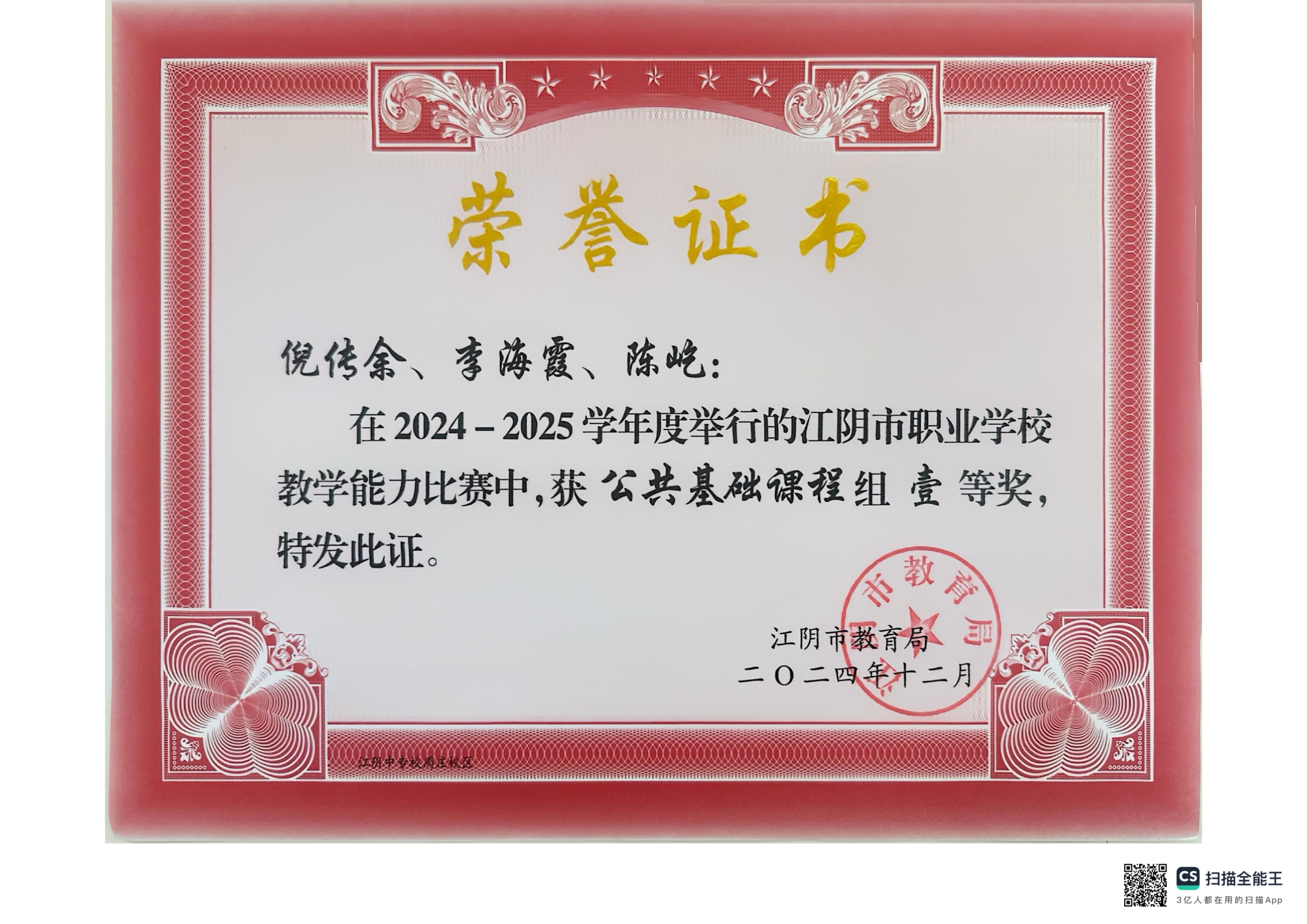 季春花工作室成员倪传余、陈屹老师在2024-2025学年度江阴市职业学校教学能力比赛中获得公共基础课程组一等奖 2025-09-28