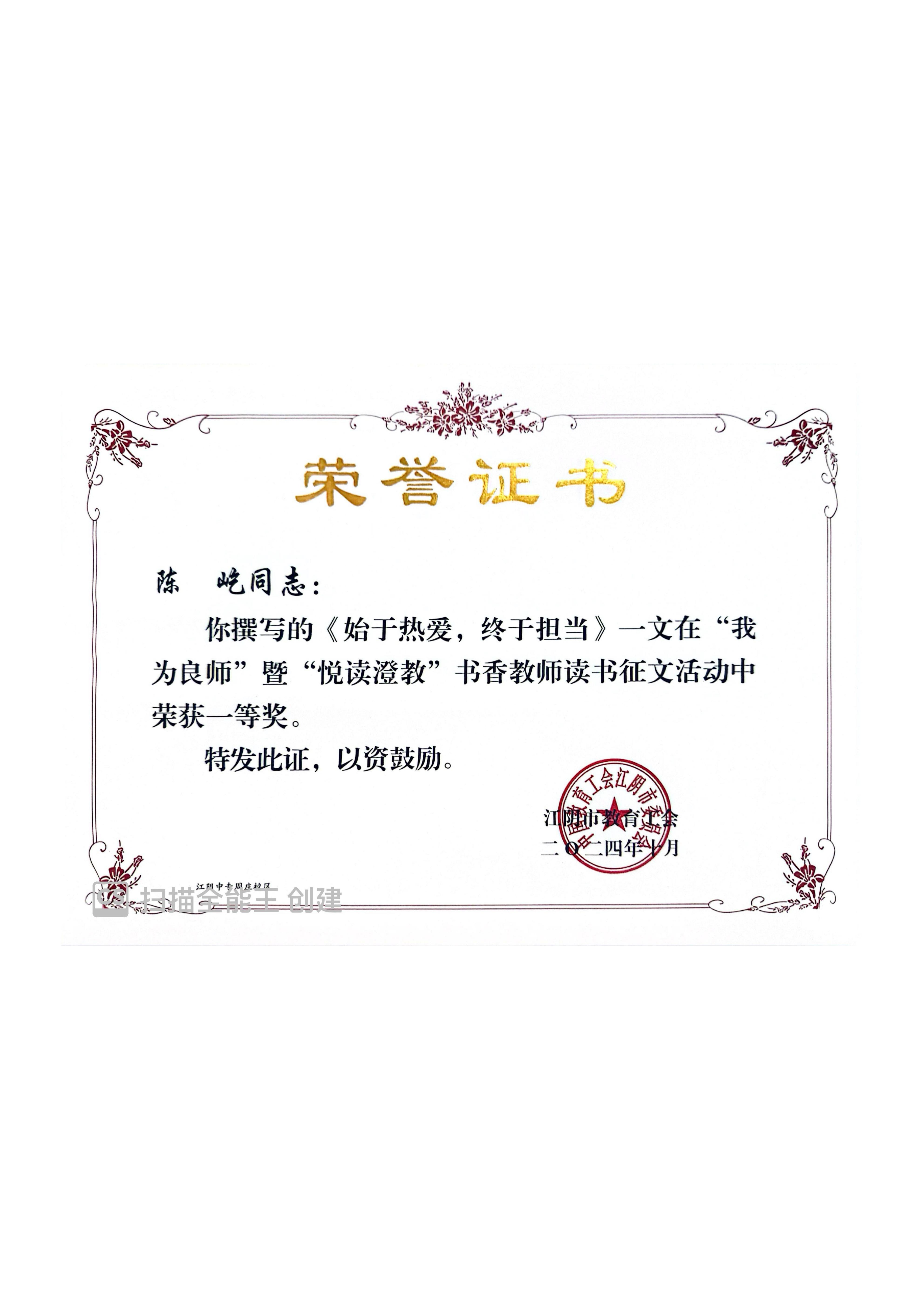 季春花名师工作室成员陈屹老师“我为良师”暨“悦读澄教”书香教师读书征文活动中荣获一等奖