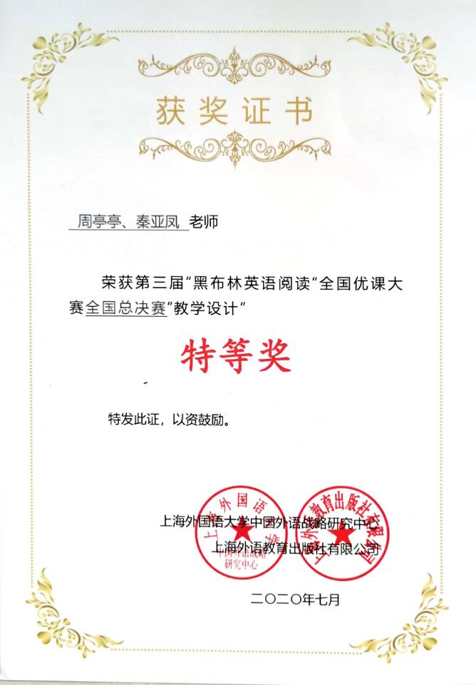 周亭亭、秦亚凤老师获第三届“黑布林英语阅读”全国优课大赛全国总决赛教学设计特等奖