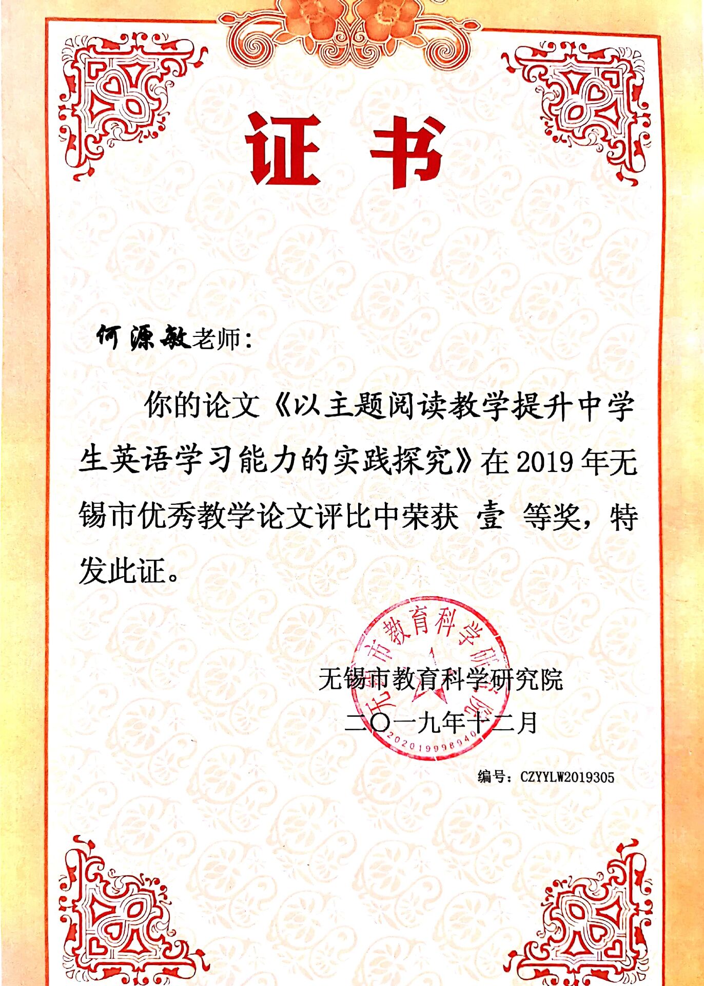 何源敏老师的论文《以主题阅读教学提升中学生英语学习能力的实践探究》获无锡市优秀教学论文评比一等奖